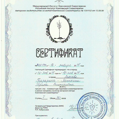 Международный институт комплексной сказкотерапии 2015г. – сказкотерапевт.
