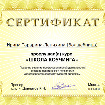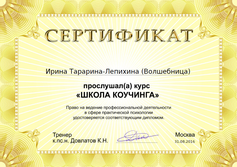 Коучинг прошел для меня в несколько неожиданной форме, но очень легко и приятно . Многие вещи (мысли) стали на свои места ! Я определилась с целью и осознала, что она выполнима! Я разрешила себе быть: счастливой в браке ПОСЛЕ сессий очень легкие ощущения в теле, душе, произошло очень важное для меня осознание.