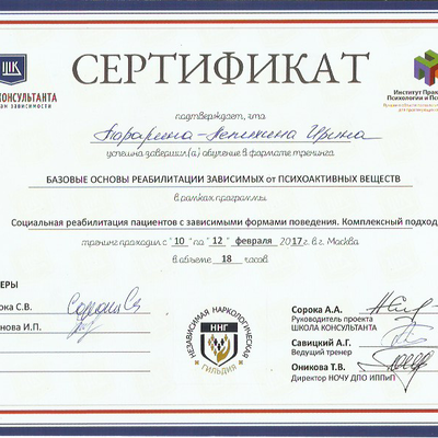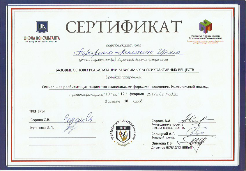 Институт практической психологии и психоанализа 2017г. – повышение квалификации «Социальная реабилитация пациентов с зависимыми формами поведения. Комплексный подход»