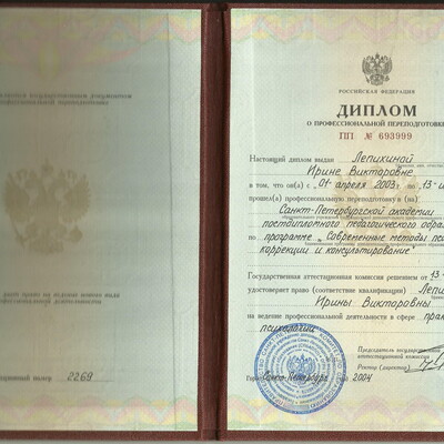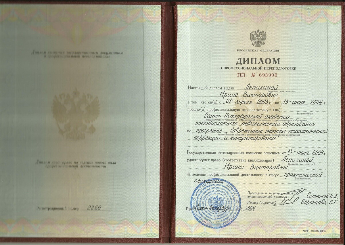 Санкт-Петербургская академия постдипломного педагогического образования 2003 – 2004г. – современные методы психологической коррекции и консультирования.